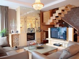 На первом этаже отлично впишется просторная гостиная. В этой комнате удобно принимать гостей, не показывая другие комнаты, или проводить вечера в кругу семьи. Рядом комфортно будет оборудовать кухню. Оттуда будет удобно выносить гостям приготовленные блюда, либо устраивать посиделки прямо в ней. Эти две комнаты можно соединить холлом, где будет уместно поставить платяной шкаф либо оборудовать небольшую кладовую.